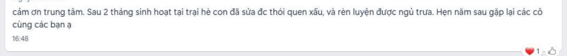“ Cảm ơn trung tâm. Sau 2 tháng sinh hoạt tại trại hè con đã sửa được thói quen tật xấu….”