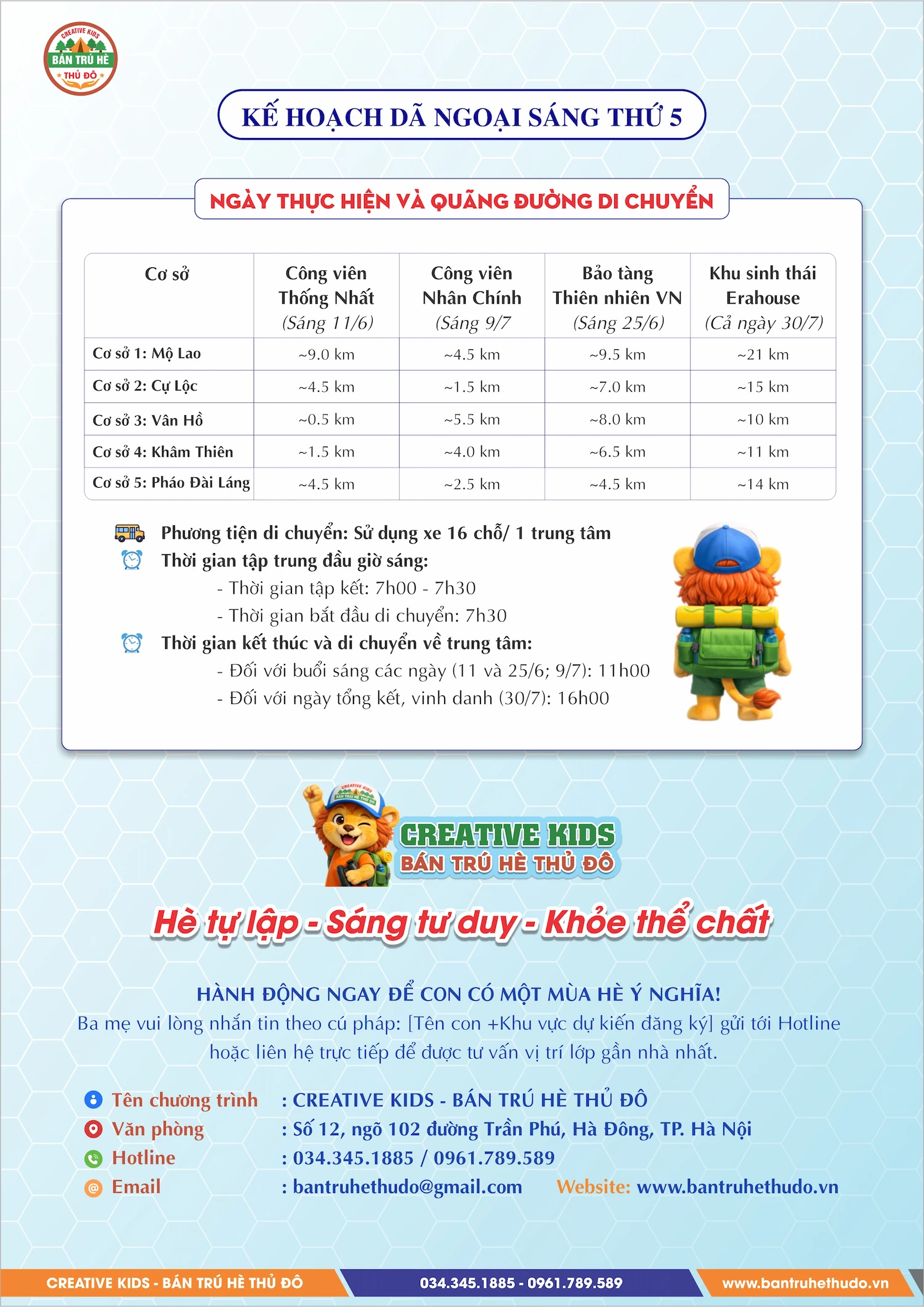 | 08h00 – 10h30 | Trạm trải nghiệm thực địa | – Triển khai hoạt động tại thực địa. – Cấp nước và nghỉ bóng mát 30 phút/lần. – Quay 01 video ngắn (30s) gửi nhóm Zalo. |